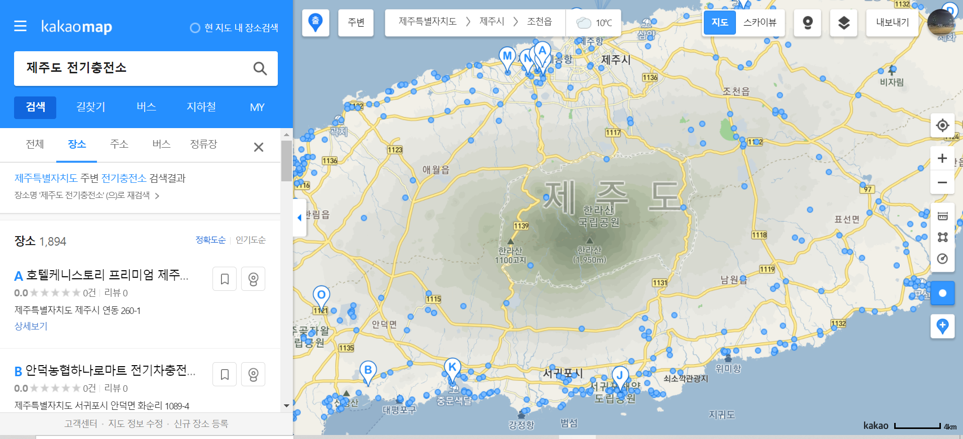 '제주도 전기충전소'로 검색을 하면 수많은 파란 점들과 알파벳 문자를 볼 수 있습니다. 카카오 API는 파란 점들은 검색해주지 않고 알파벳으로 띄워진 정보들만 알려줍니다. 이게 최대가 45개입니다.