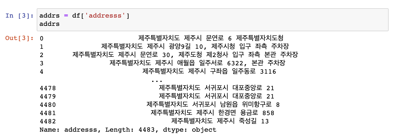 저에게는 약 4400여개의 도로명 주소 목록이 있습니다. 여러분도 엑셀 파일에 저장된 데이터 중에서 도로명 주소 칼럼만 가져오시면 됩니다.